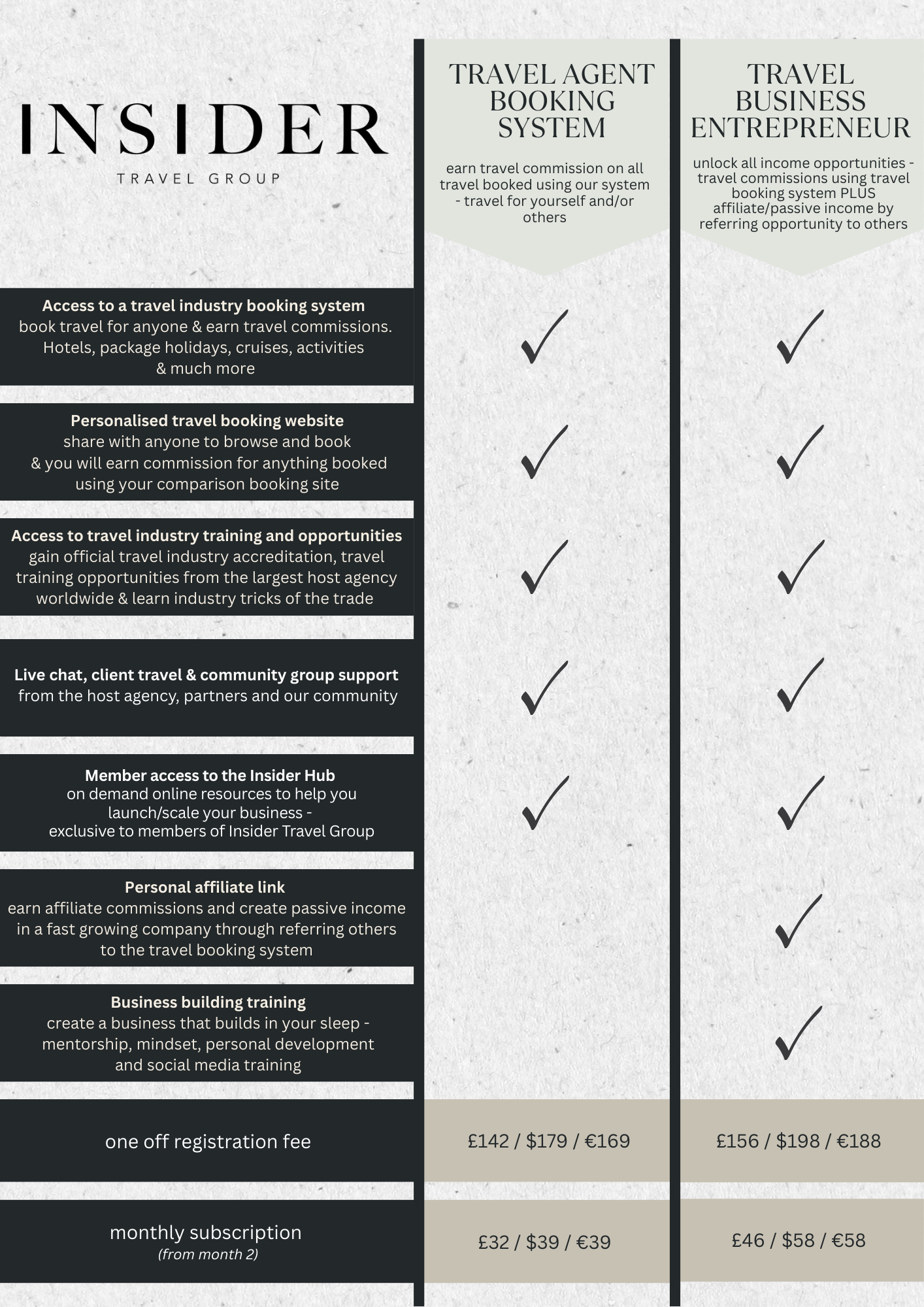 You'll receive your personal Insider Travel Group member space login - which contains our exclusive tips for success, branding and templates for you to use if you wish.